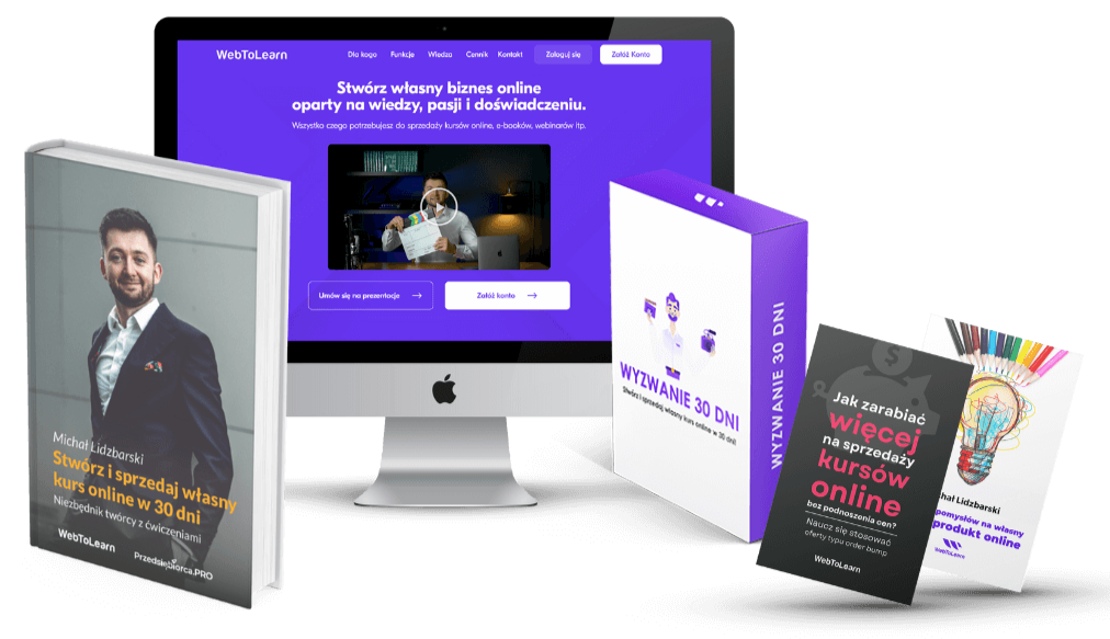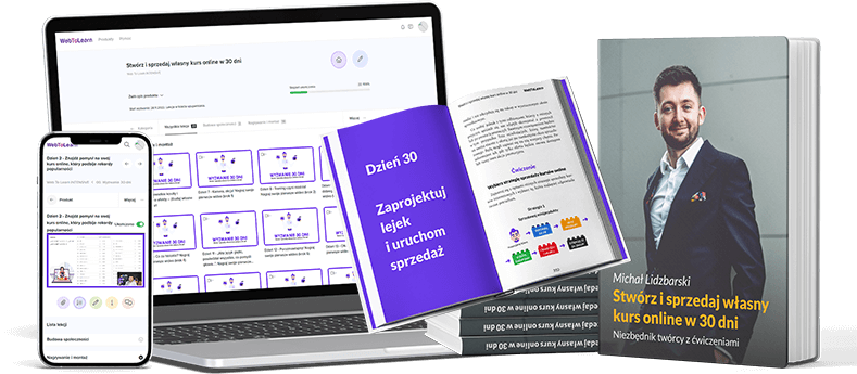 Kurs online oraz e-book udostępniany jest za pośrednictwem platformy Web To Learn. Po zaksięgowaniu płatności otrzymasz link z unikalnym kodem dostępu. Książka wysyłana jest kurierem INPOST.
